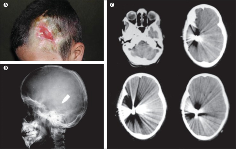 La velocidad terminal de una bala necesaria para penetrar la piel está entre 45,1m/s y 60,0m/s (148 y 197 pies por segundo) y una bala que viaje a menos de 60m/s (200 pies por segundo) puede penetrar el cráneo. Si tenemos presente que las balas que caen tienen la capacidad de alcanzar hasta 180m/s (600 pies por segundo), las balas podrían ocasionar una doble penetración del cráneo y no solo una perforación».